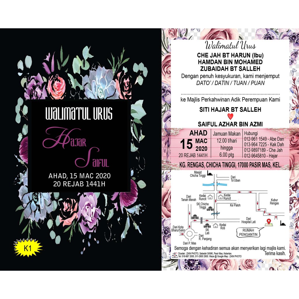 Anda boleh dapatkan panduan perkahwinan untuk merancang dan menempah kad kahwin anda sendiri. Dapatkan kad kahwin, banner/bunting kahwin, sticker kahwin, button badge yang termurah di malaysia. Kini memudahkan anda untuk meraikan majlis keraian dan perkahwinan. …sesuai untuk mereka yang mahu buat kad kahwin sendiri tetapi tiada kemahiran untuk menggunakan perisian grafik yang complicated. Tetamu boleh save event terus ke kalendar telefon. Kami akan kirimkan artwork untuk anda sahkan. Kad kahwin ni perlu disiapkan awal ada beberapa sebab antaranya adalah ianya perlukan masa untuk disiapkan oleh pihak printing dan paling penting adalah edaran kad kahwin itu sendiri perlulah dibuat lebih awal supaya orang yang dijemput mudah untuk membuat. Pihak nurfa.com akan follow up anda kembali untuk pengesahan design melalui no whatsapp yang diberikan di ruang maklumat penghantaran. Contoh kad kahwin yang menarik untuk jemputan hari istimewa nikahsatu. Kad kahwin juga bertujuan untuk menwar warkan bahawa anda telah berkahwin. Review pelanggan yang menempah kad kahwin pakej lain dari kami. Ayat kad kahwin untuk menjemput individu daripada berbagai latar belakang. Jangan ada yang curi mentah2 gambar tutorial kam dan post di fb boleh tak ajar macam mana cara nak edit kad kahwin yg dah siap diprinting untuk tulis nama tetamu jemputan?